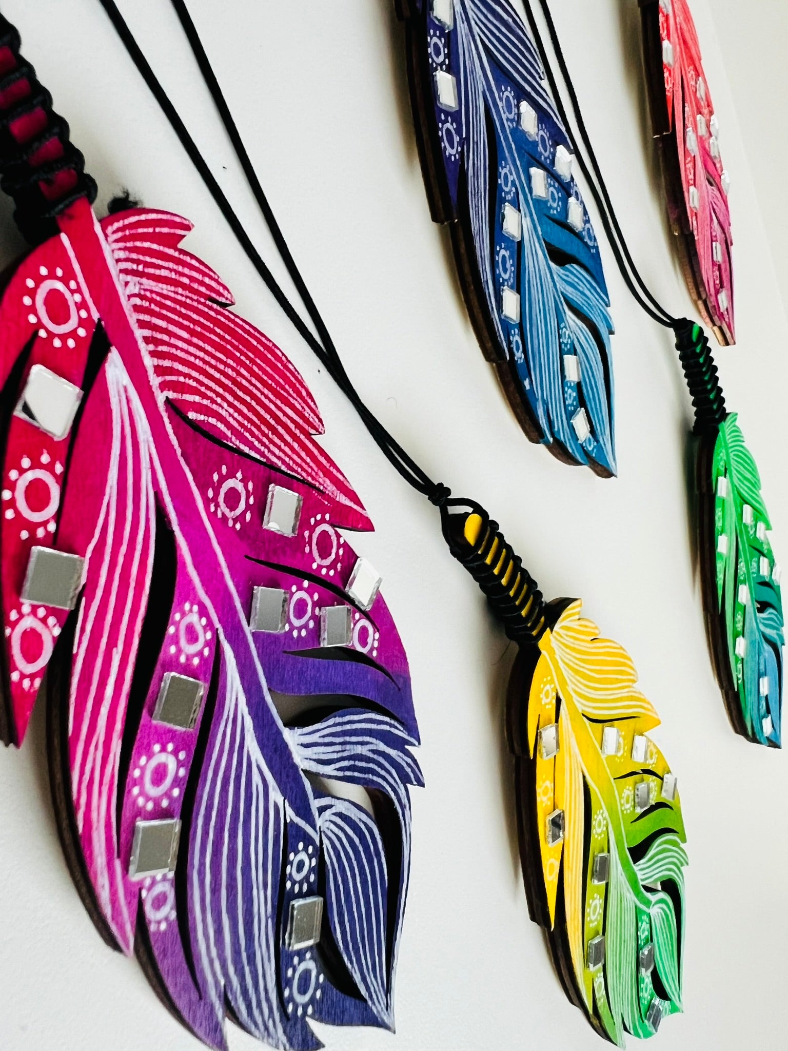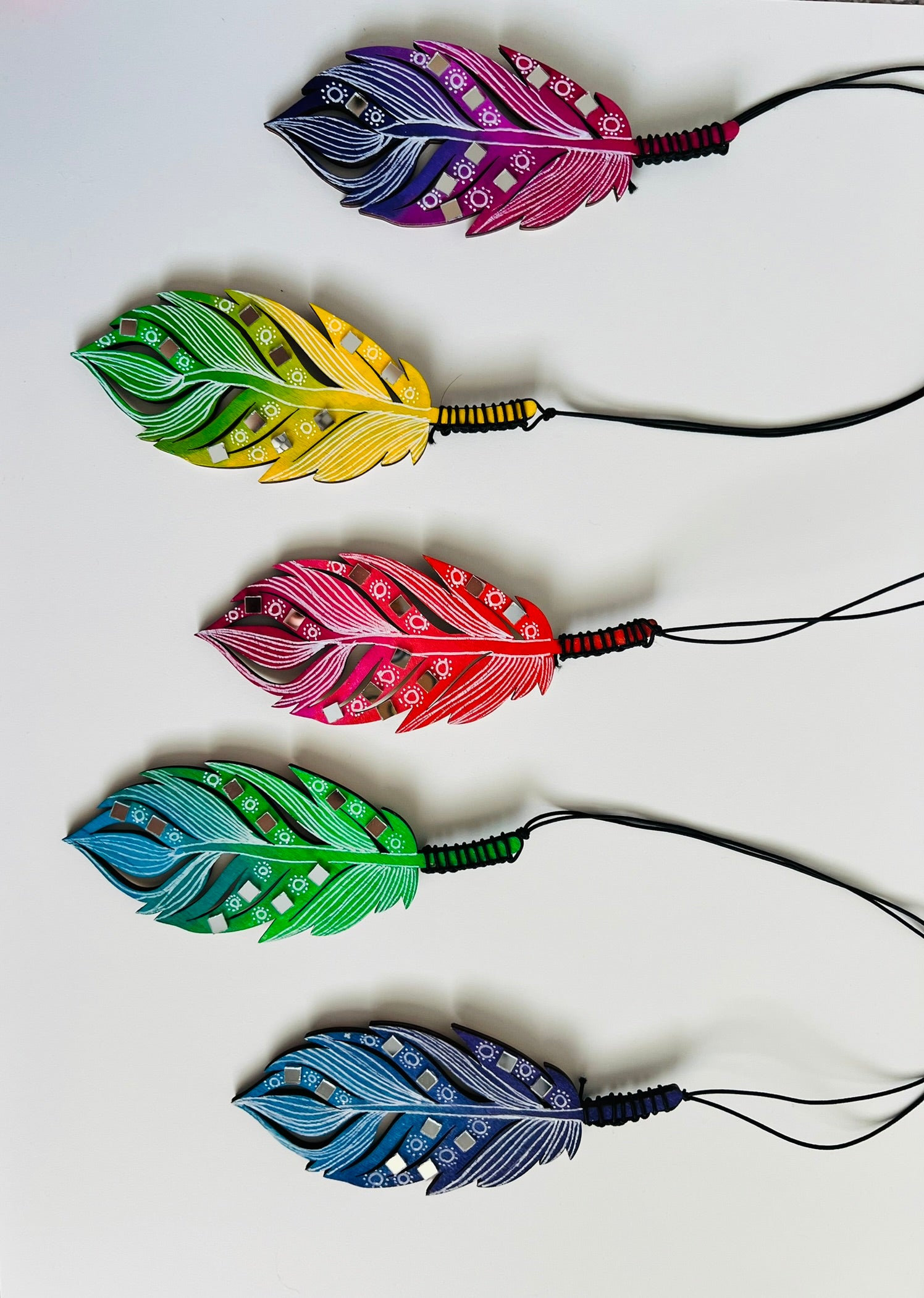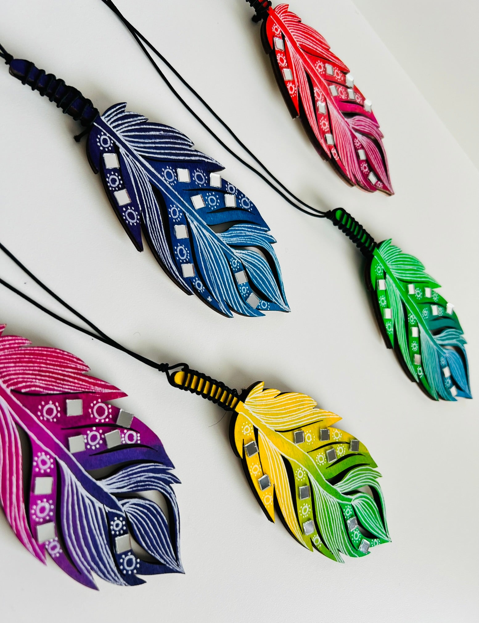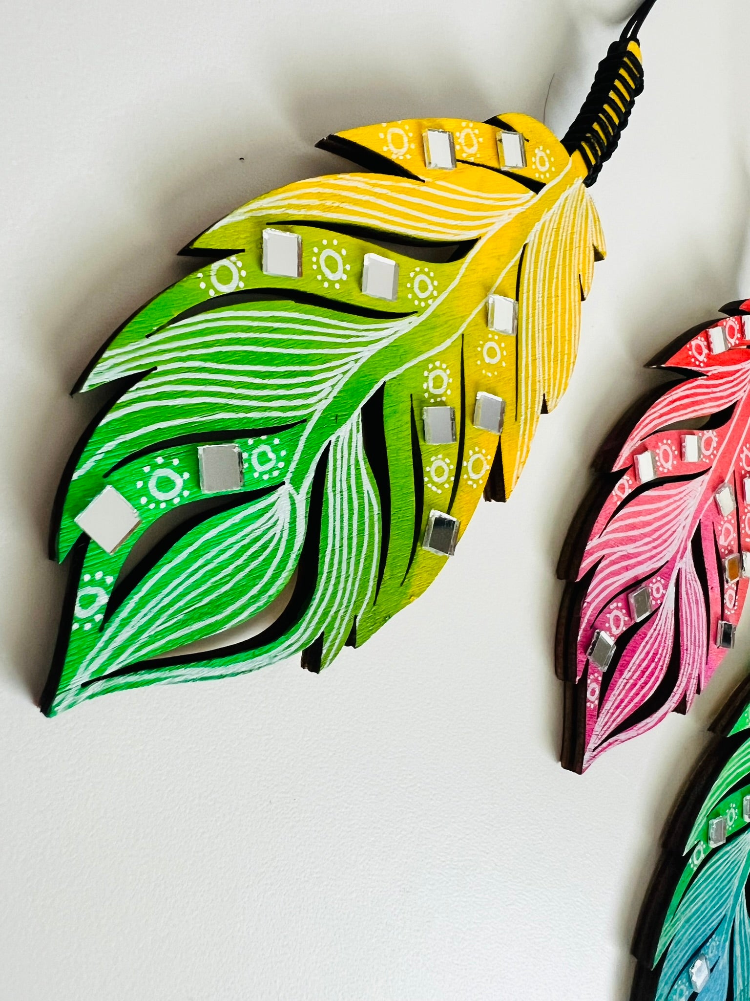 Bring the essence of bohemian style into your home or on-the-go with this stunning wooden feather wall hanging. Each piece is a unique work of art, perfect for adding color and charm to your living space, car, bag, or office. Whether you're decorating a bedroom, living room, or personal accessories, this feather charm is sure to be a delightful addition.