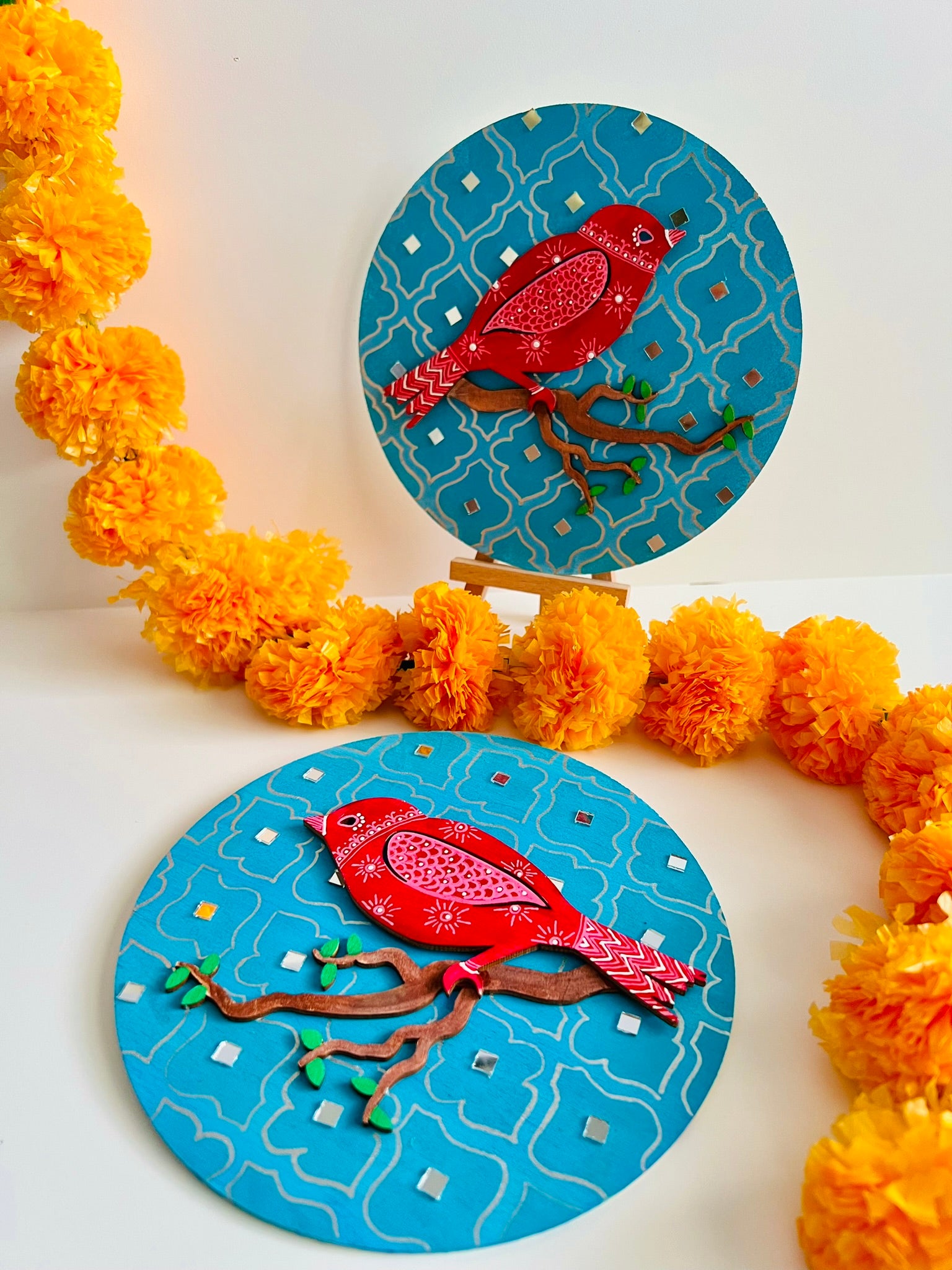 Add a splash of color and charm to your space with these exquisite wall plaques, featuring beautifully handcrafted pink munia (avadavat) birds perched gracefully on a branch. The vibrant munia are set against a stunning ethnic Indian jali background, enhanced with silver glitter accents and tiny mirrors that catch the light, adding a touch of sparkle to any room.